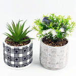 This Faux Floral Plant Assortment with Pebbles and cement Decorative Embossed Planter is a beautiful blend of nature's splendor with a modern design that effortlessly enhances any space. This stunning arrangement will fit right in whether you're sprucing up your home, office, or event decor. The faux floral assortment boasts realism, mimicking the intricate details and vibrant greens of natural flowers and plants. Say goodbye to wilting petals and constant maintenance; these artificial beauties stay fresh year-round. The heavy cement base features an embossed crisscross pattern. Features natural pebbles securely placed inside the pot. The planter measures 4" x 4.35" with a 3" tall florals and plants. Comes packaged loose with a color label on the bottom.,Faux Floral Plant Assortment with Pebbles Cement Decorative Embossed Planter,