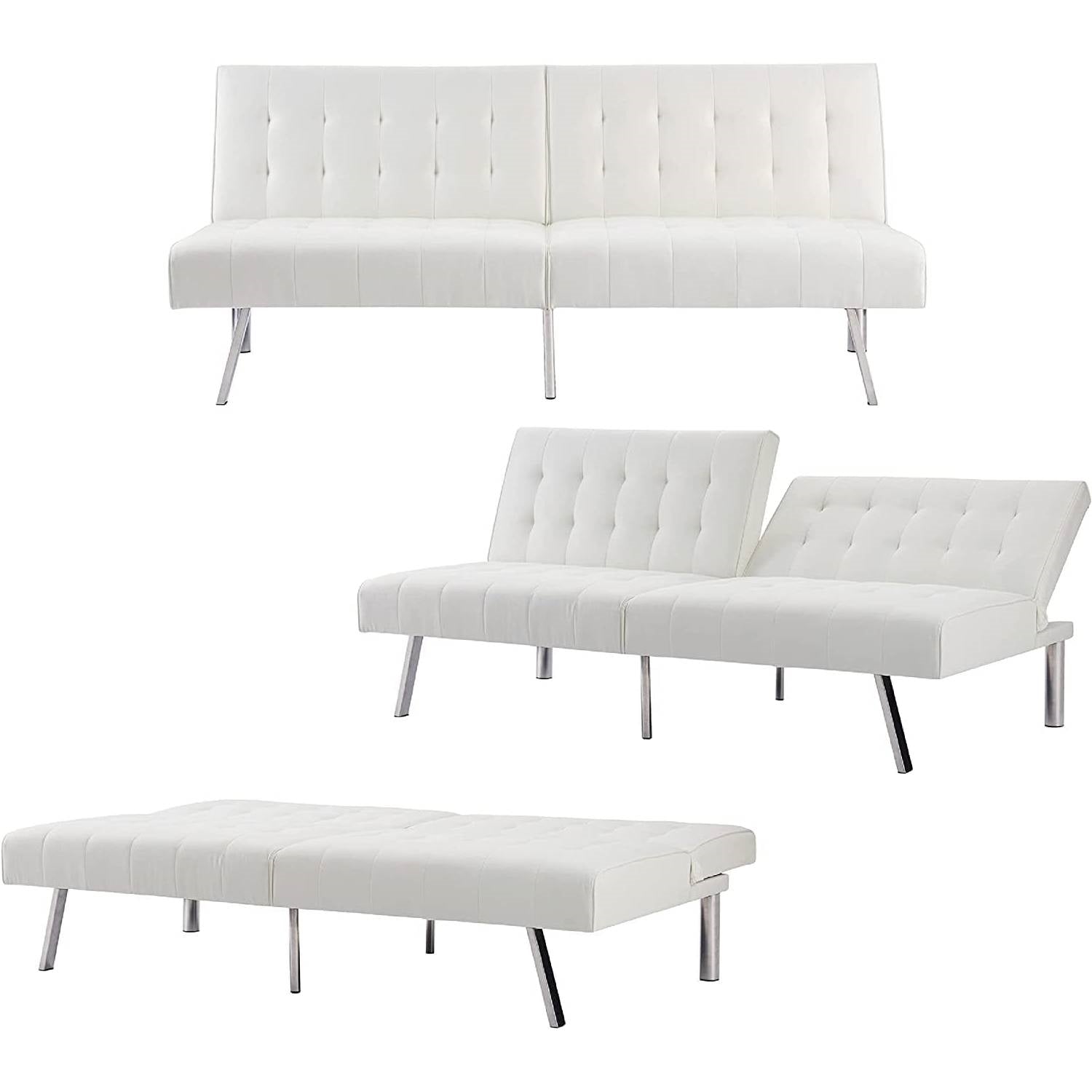 - Mid-Century Modern Split Back Futon Sleep Sofa Bed in White Faux Leather