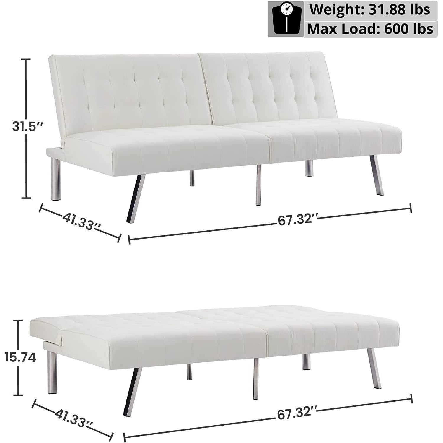 - VERSATILITY: Perfect for small spaces, this futon convertible sofa cama para sala is well suited for any apartment or studio. The Split Back design also provides the added comfort of adjusting different incline angles for either side of the White Futon Sofa. A robust frame, thick padded support with PU faux leather and stable legs made of Chrome make this Convertible Sofa Bed your ideal choice.