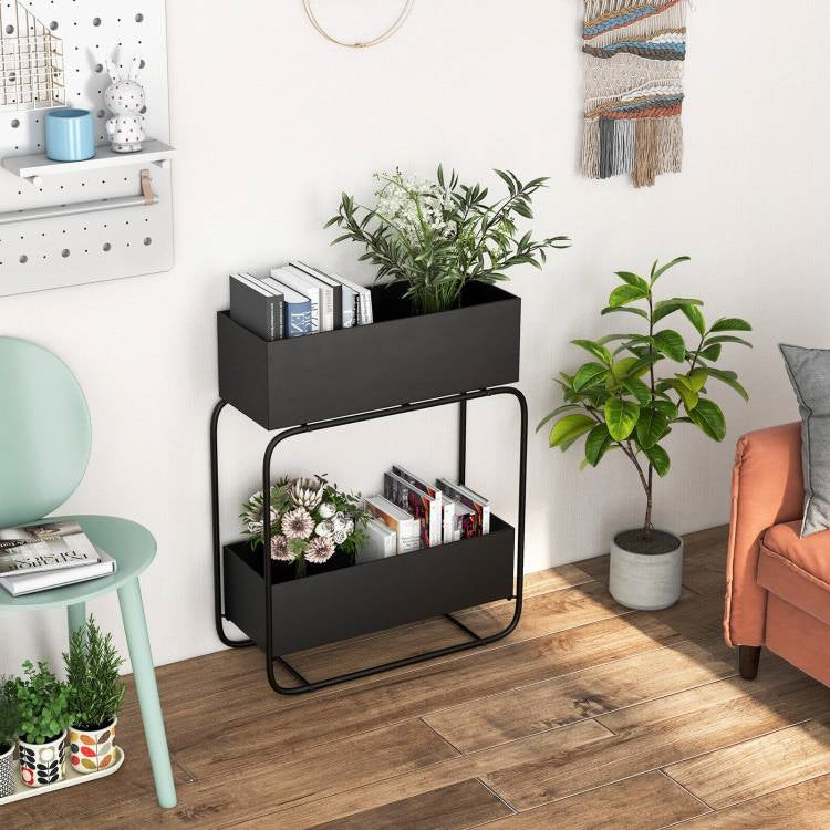 This 2 Tier Black Metal Vertical Garden Planter Box is ideal growing kinds of flowers, vegetables, herbs, etc. Made of sturdy metal and supported by a stable rectangular frame, the raised planter box holder is solid, crack-resistant and not easily deformed. Metal frame features an anti-rust coating to ensure a long lifespan in the outdoors. Featuring smooth lines and rectangular slim boxes, the 2-tier flower box looks simple yet stylish, which blends well into a wide range of indoor and outdoor occasions. And its vertical design is a space solution for small apartments, gardens, balconies, etc.