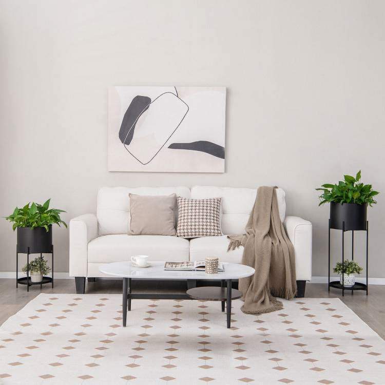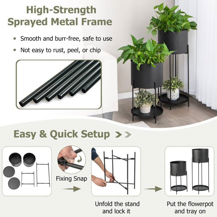 This Set of 2 Black Metal Garden Planter Pot with Storage Shelf is constructed of high-strength sprayed metal ensuring long service life. The flowerpot set includes 2 planter pot stands of different sizes, which are suitable for displaying plants in different sizes. This plant stand with pot is quite easy to set up, and all you need to do is unfold the stand and lock it with the fixing snap, then put the flowerpot and tray on, which would finish in seconds. And the installation process requires no tools.