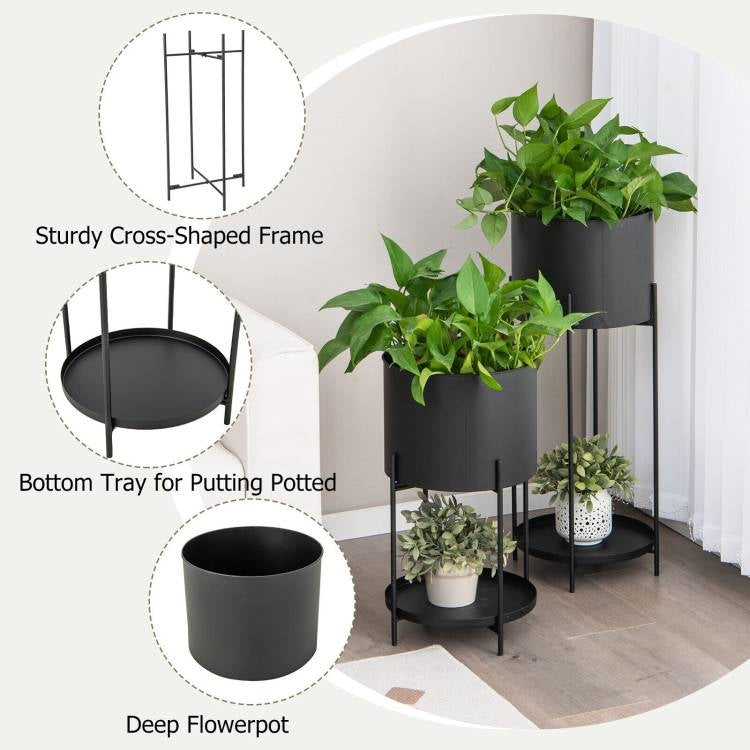 Set of 2 Black Metal Garden Planter Flower Pot Stand with Bottom Shelf